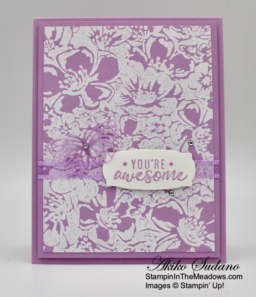 I used my stamparatus to stamp the Stampin’ Up! Wild Roses background stamp in Versamark ink on a Fresh Freesia Panel. I used the magnets to hold the card stock down and inked up the stamp and stamped it a couple of times to get good coverage, pressing all around the stamp each time. I covered the panel with white embossing powder and shook off the excess. I heated the embossing powder with my heat tool, being careful to make sure it was all shiny. I trimmed the panel down to 3-3/4″ x 5″ and adhered it to a Fresh Freesia mat. I popped the panel on the front of a Fresh Freesia card base with dimensionals.