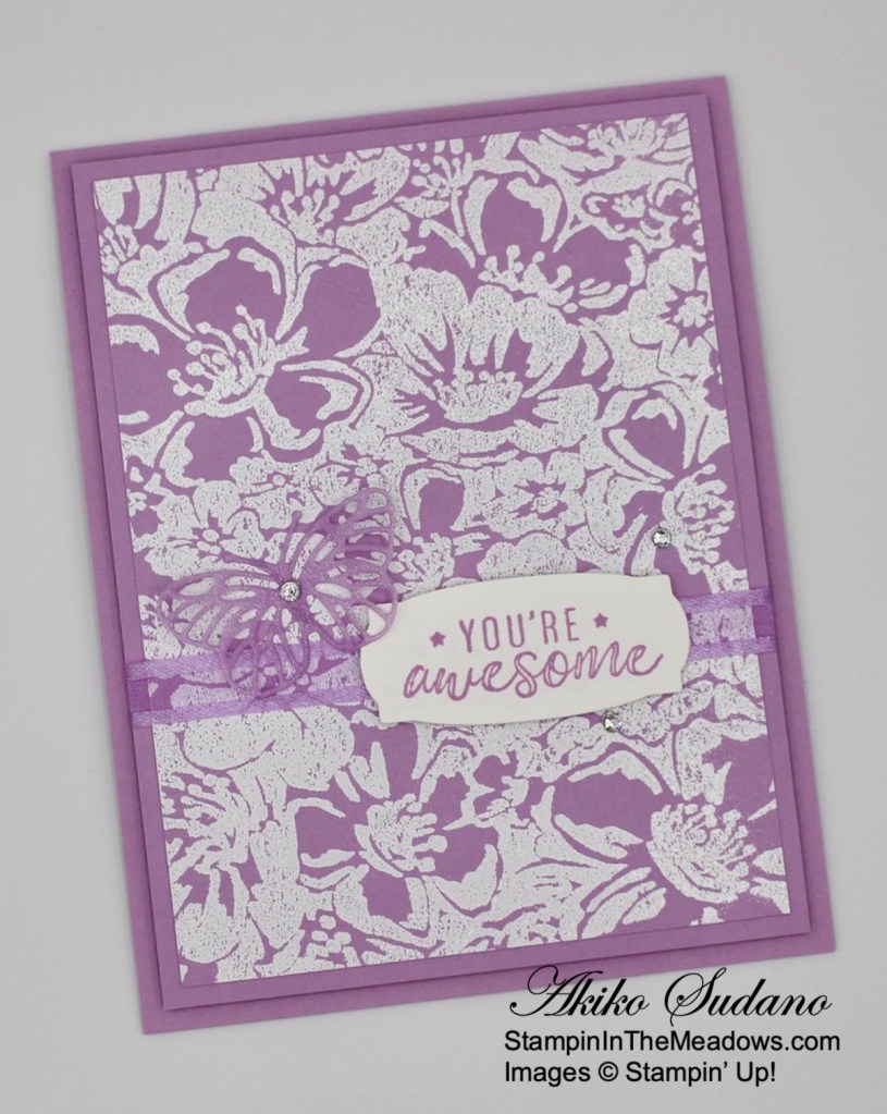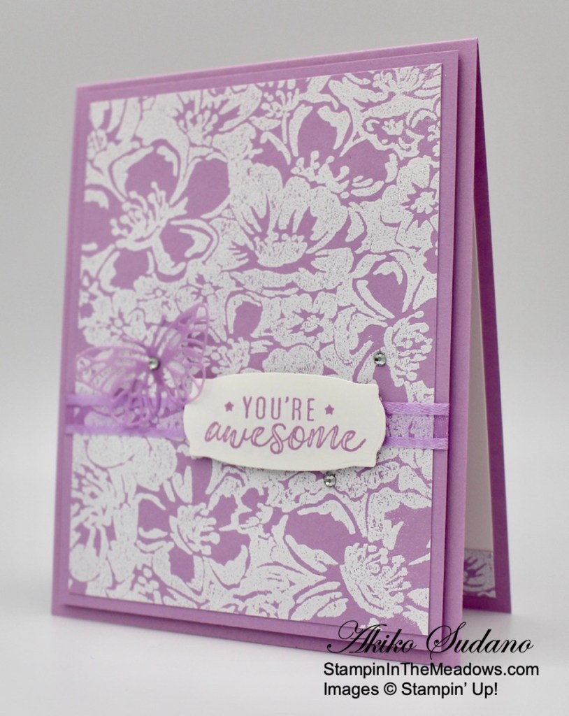 Happy Wednesday! Today I’m sharing a simple monochrome card made with the Stampin’ Up! Wild Roses cling stamp set in Fresh Freesia. I made a thank you card with this stamp last week, kind of in reverse and you can see it here. Today’s card is kind of the reverse because I used versamark ink with white embossing powder to create a card with lots of shine. You can find the supplies I used at the bottom of my post along with the sizes of cardstock used.