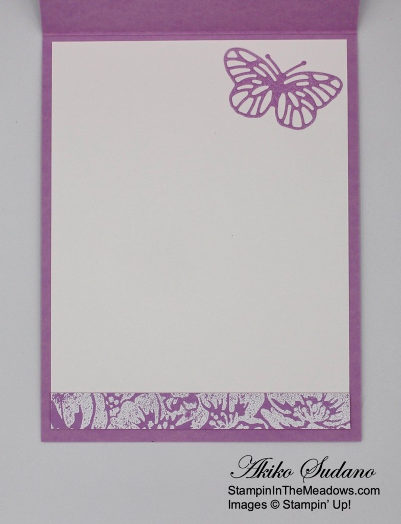 For the inside of the card, I used the Stampin’ Up! Wild Roses stamp again on a strip of Fresh Freesia card stock and embossed it with white embossing powder. I adhered it to the bottom of a Basic White panel. I adhered a panel of adhesive strip to the back of another panel of Fresh Freesia Vellum and cut out another small detailed butterfly from the Brilliant Wings dies. I peeled of the adhesive backing and adhered it to the top of the panel, pressing it with my bone folder to make sure it was secure. I adhered the panel to the inside of the card.