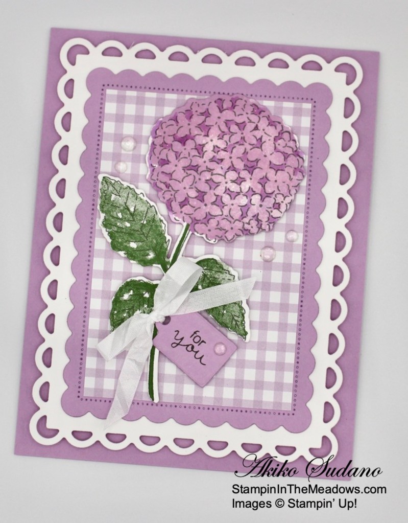 I’m so glad that the Stampin’ Up! Hydrangea Haven bundle was carried over in the 2021-2022 Annual Catalog with the 10% savings. It’s such a pretty set and doesn’t the flower look great in Fresh Freesia? There are so many colors of hydrangea in bloom these days and and it makes the landscape so pretty!