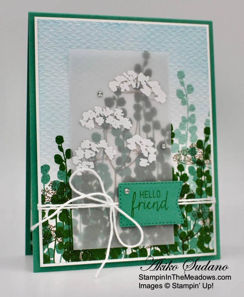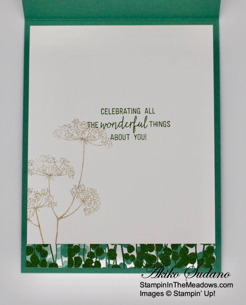 4. What a gorgeous card, Akiko! I have to tell you….yesterday would have been my 59th anniversary. For our wedding a lady in our church did the flowers, and she used Queen Anne’s Lace and White gladiolas. My colors were mint green and white. Your card is perfect! As much as I love Queen Anne’s Lace, I had not purchased this set. Your card makes me realize it is a ‘must have’ for me. Thank you.