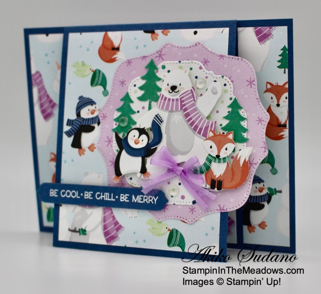 - Penguin Playmates DSP – 4″ x 5-1/4″ (base panel background), 3-1/4″ x 4″ (front background), 3-3/4″ x 3-3/4″ (Fresh Freesia die cut), 3″ x 3″ (dotted die cut), 1/2″ x 3-1/4″ (inside trim), fox, polar bear and penguin fussy cut image