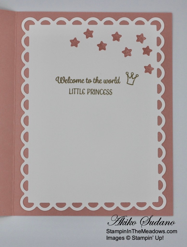 For the inside of the card, I cut a Basic White panel with the largest Scalloped Contours die and stamped the sentiments and little crown from the Prince and Princess photopolymer stamp set in Sahara Sand ink. I stamped the stars from the Stampin’ Up! All For Baby stamp set in the corner and adhered the panel to the inside of the card.