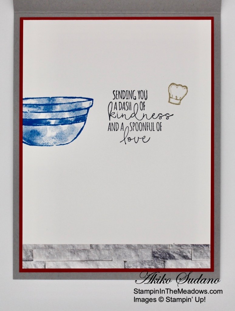 For the inside of the card, I stamped the sentiment from the Stampin’ Up! What’s Cookin’ stamp set in Memento Tuxedo Black ink on a Basic White panel. In stamped the bowl next to the sentiment in Pacific Point and one of the little chef’s hats in Sahara Sand. I adhered a strip of In Good Taste DSP to the bottom of the panel and adhered it to a Real Red mat before adhering it to the inside of the card.