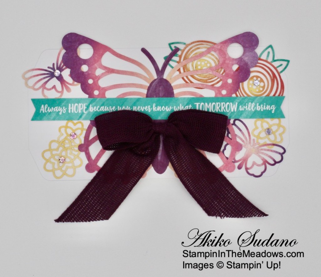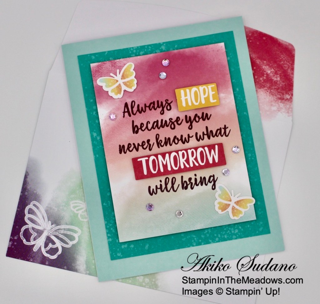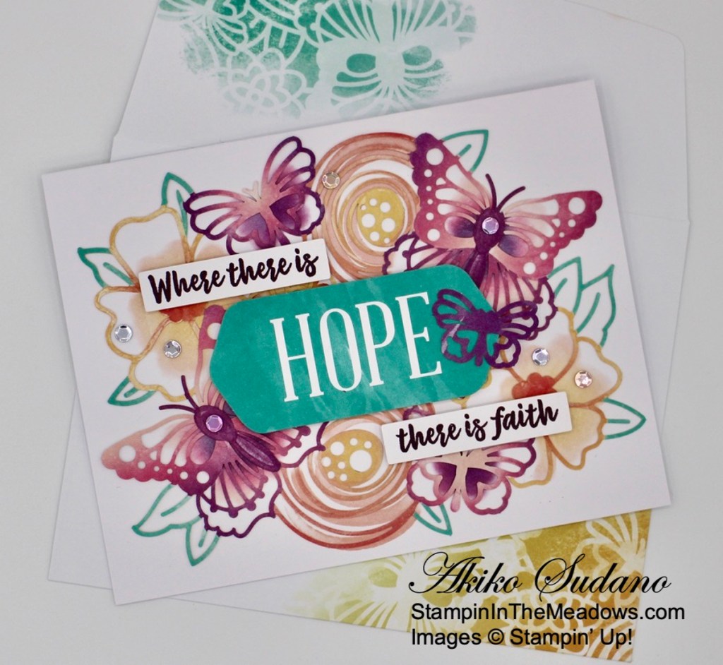Good Morning! I got my Stampin’ Up! August Paper Pumpkin kit this week and made one of each of the cards. This kit is so colorful and full of butterflies and flowers and makes nine pretty cards. It comes in a special decorative box and has extra accessories to turn it into a Hope Box – a keepsake box that you can fill with special treats and trinkets to inspire hope and encouragement.