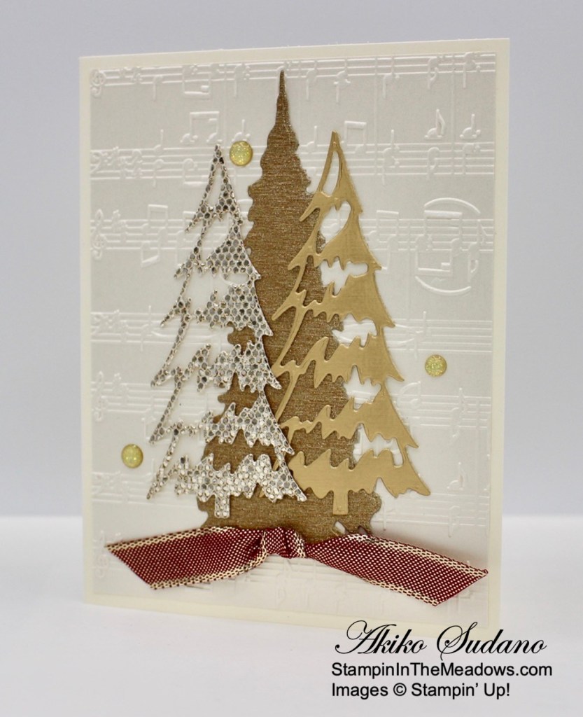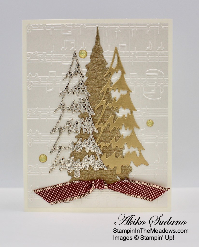 I cut the largest tree from the Christmas Trees dies from the Stampin’ Up! Whimsical Trees bundle from the gold metallic specialty paper. I cut two of the detailed trees, one from the Be Dazzling specialty paper, A Sale A Bration item that is free with a $50 purchase before shipping and taxes, and one from the gold Brushed Metallic foil. I adhered them to the card front with mini glue dots.