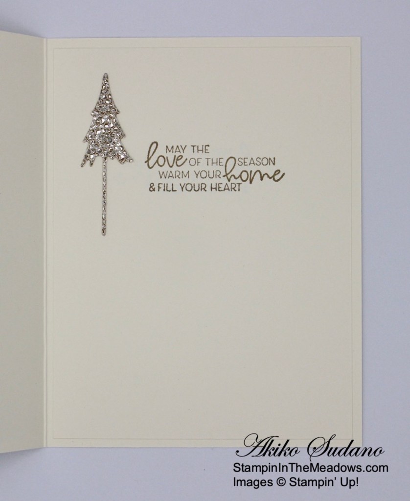 For the inside of the card, I stamped sentiment from the Stampin’ Up! Whimsical Trees cling stamp set in Sahara Sand ink on a Very Vanilla panel. I cut a small tree from Be Dazzling specialty paper and adhered it next to the sentiment and adhered the panel to the inside of the card.