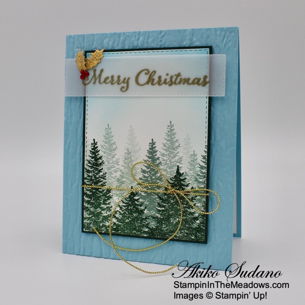 Good Morning! I have been having fun with the Stampin’ Up! Evergreen Elegance cling stamp set, making Christmas cards this past week and here’s another take. This time, I stamped an evergreen forest in Evening Evergreen and Soft Succulent and accented it with touches of gold! You can find the supplies I used at the bottom of my post along with the sizes of cardstock used.