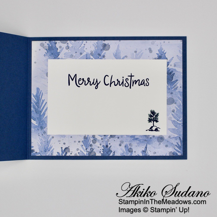 I stamped the sentiment from the Stampin’ Up! Snowman Season stamp set in Night of Navy on Basic White. I inked up the little tree in Night of Navy and stamped it in the corner and colored it with the Soft Succulent blend. I adhered the panel to the inside of the card.