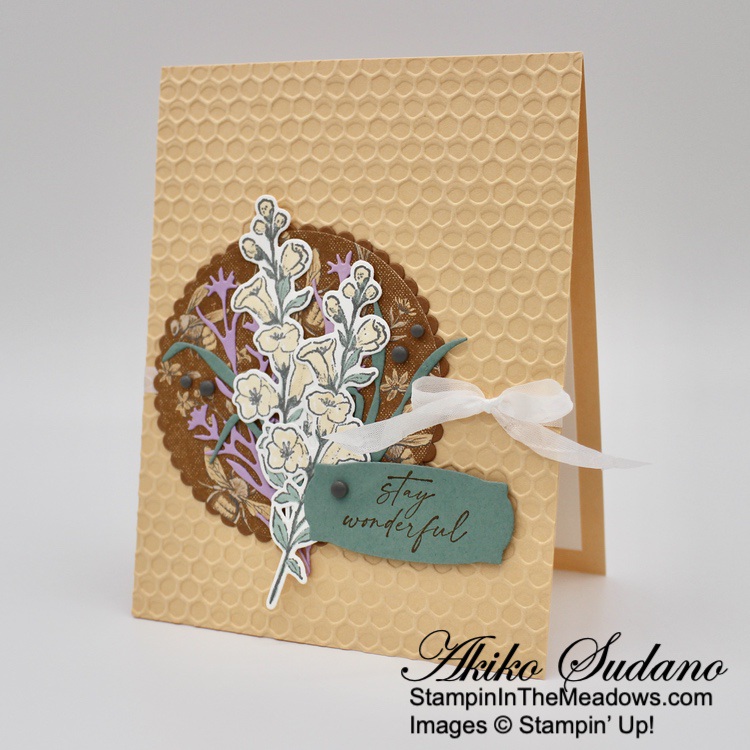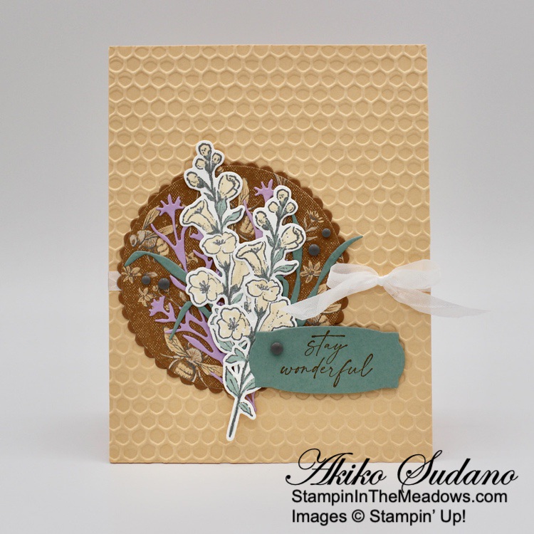 I embossed a panel of Pale Papaya designer series paper with the new Hive 3D embossing folder and adhered it to the front of a Pale Papaya card base. I wrapped a length of white crinkle ribbon around the card front, tying a bow on the side. I cut a panel of Heart & Home designer series paper with a Layering Circle die and adhered it to a Cinnamon Cider die cut scalloped circle and adhered it to the card front with liquid glue.