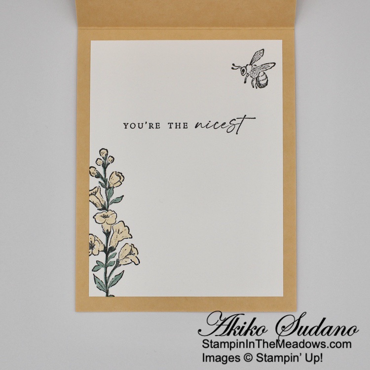 For the inside of the card, I stamped the sentiment from the Stampin’ Up! Honeybee Home stamp set in Basic Gray on a Basic White panel. I stamped the little bee in the top corner and the flowers in the lower corner, also in Basic Gray. I colored the flowers like the front and adhered the panel to the inside of the card.