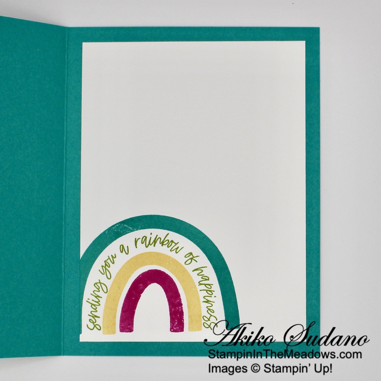 For the inside of the card, I stamped the rainbow bands and sentiment from the Stampin’ Up! Rainbow Of Happiness stamp set in Magenta Madness, So Saffron, Granny Apple Green and Bermuda Bay in the lower corner of a Basic White panel. I adhered the panel to the inside of the card.