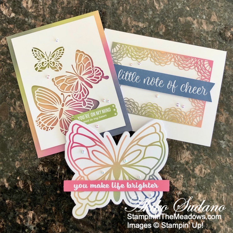 Good Morning! The Stampin’ Up! Notes of Cheer card kit is one of the kits in the Stampin’ Up! Kits Collection and it’s one that doesn’t require any stamping! It’s perfect for when you’re short on time or for beginning card makers. I made some of the cards in the kit with my grandchildren and it was fun. They loved the butterflies – especially the butterfly shaped card – and they’re great at using dimensionals and adhesive gems.