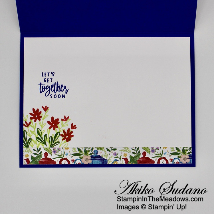 I stamped the sentiment from the Stampin’ Up! Cup Of Tea stamp set in Starry Sky ink on Tahitian Tide and cut it out with the long skinny stitched rectangle die. I adhered it to the embossed panel and teacup with glue dots and dimensionals and adhered the decorated panel to the front of a Starry Sky card base. I finished the card front with new 2022-2024 In Color Starry Sky and Orchid Oasis dots.
