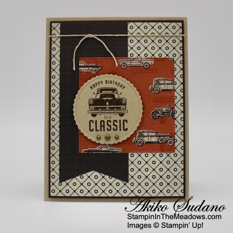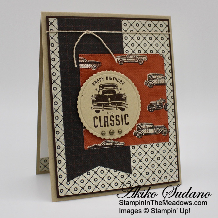 I cut a panel of the He’s the Man DSP with the largest square in the new Stylish Shapes dies (available May 3) and adhered it to the panel with liquid glue. I stamped the car and sentiment from the Stampin’ Up! He’s All That cling stamp set in Early Espresso ink on Crumb Cake. I cut it out with the pinked circle die from the bundle’s All That dies and adhered it to the panel with dimensionals.