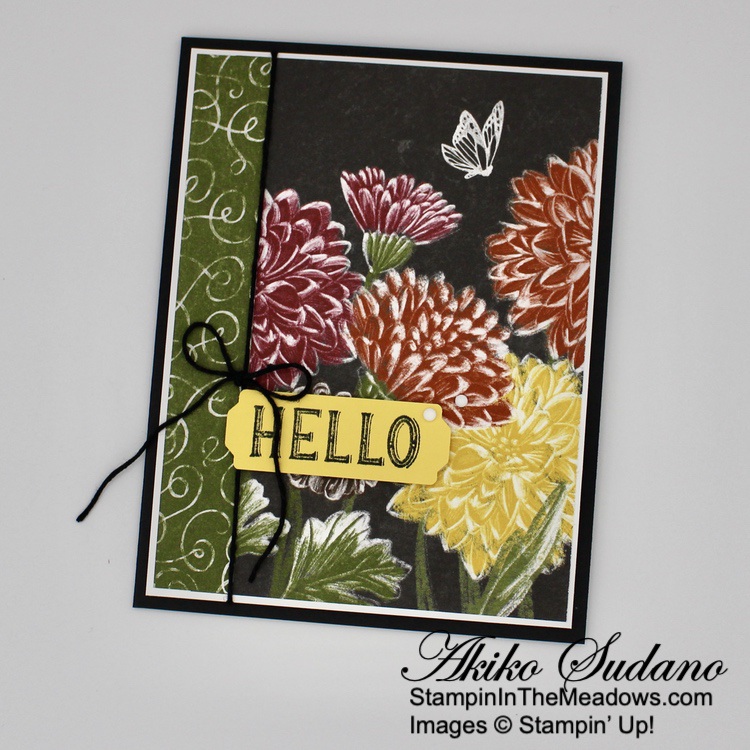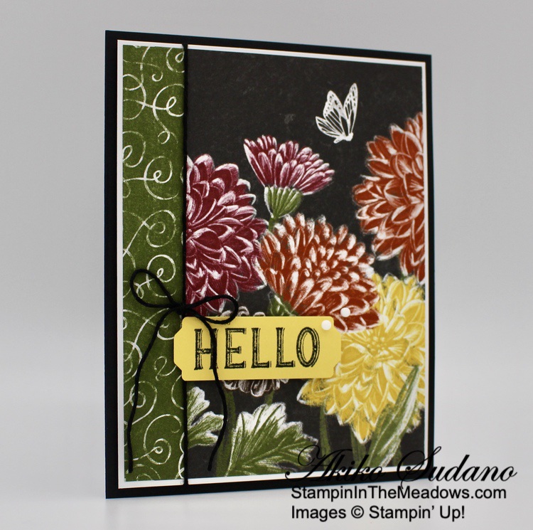 I adhered the panel to the front of a Basic Black card base with dimensionals. I stamped the pretty sentiment from the Stampin’ Up! Hello Harvest cling stamp set in Memento Tuxedo Black ink on a Daffodil Delight panel. I punched the ends of the panel with the Lovely Labels pick a punch to make it fancy.