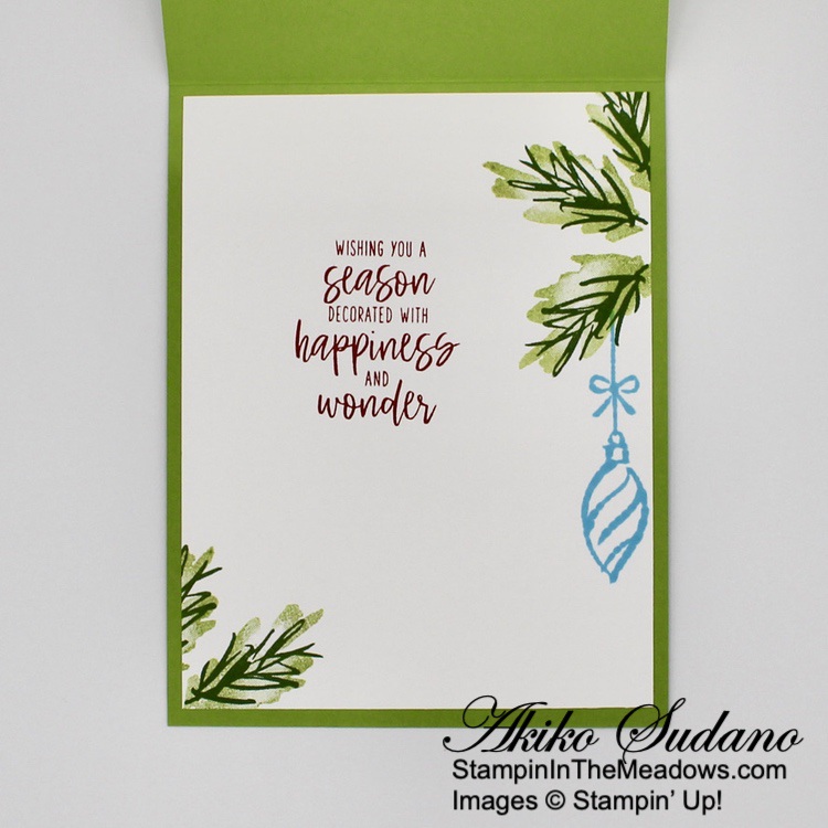 For the inside of the card, I stamped sentiment from the Stampin’ Up! Decorated With Happiness stamp set in Real Red on Basic White. I stamped boughs around the corners in Garden Green and stamped off Granny Apple Green like the front and added an ornament in Tahitian Tide.