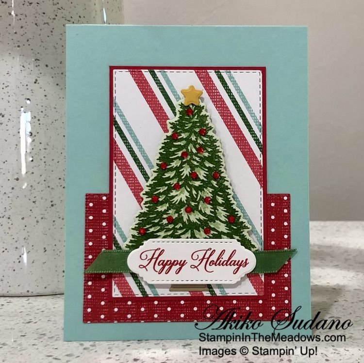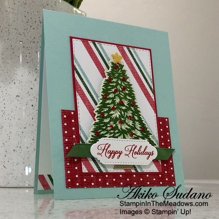 I stamped the large Christmas Tree from the Stampin’ Up! Trimming The Tree stamp set in Garden Green on Soft Sea Foam card stock. I inked up the smaller detailed tree stamp in Garden Green and stamped it off before stamping over the tree. Isn’t it pretty how the three shades of green give texture and dimension to the tree? I cut out the stamped tree with the outline die from the Tree Trimmings dies. I cut a tree stand from Crumb Cake card stock and adhered it to the card front with liquid glue. I cut a star from Crushed Curry and adhered it to the tree top with a glue dot. I used dimensionals to adhere the tree and star to the card front.