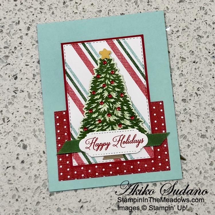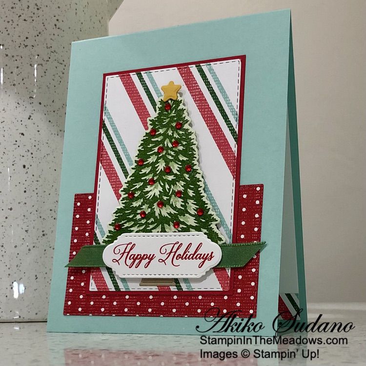 I stamped the sentiment from the Stampin’ Up! Trimming The Tree stamp set in Real Red ink on Basic White. I cut it out with the pretty label die from the Tree Trimmings dies and adhered it to a Garden Green ribbon with glue dots. I adhered the label and ribbon to the card front with dimensionals and glue dots and decorated the tree with Red Rhinestones.