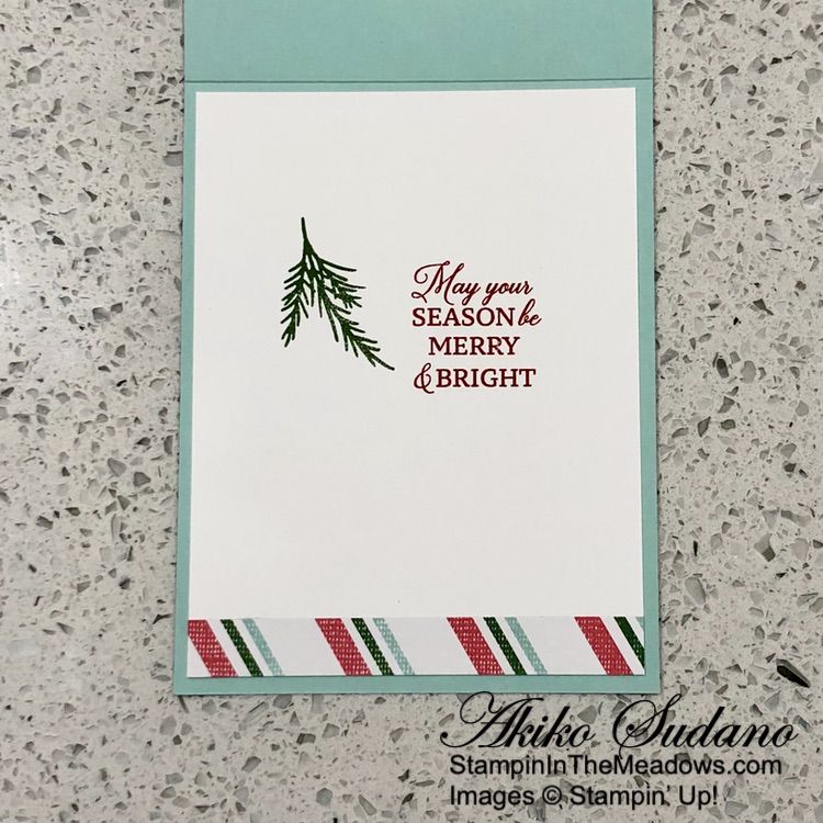 For the inside of the card, I stamped the pretty sentiment from the Stampin’ Up! Trimming The Tree stamp set in Real Red ink on a Basic White panel. I stamped the fir sprig from the Christmas Banners photopolymer stamp set in Garden Green ink next to the sentiment and adhered a strip of Sweetest Christmas DSP to the bottom. I adhered the panel to the inside of the card with Stampin’ Seal.