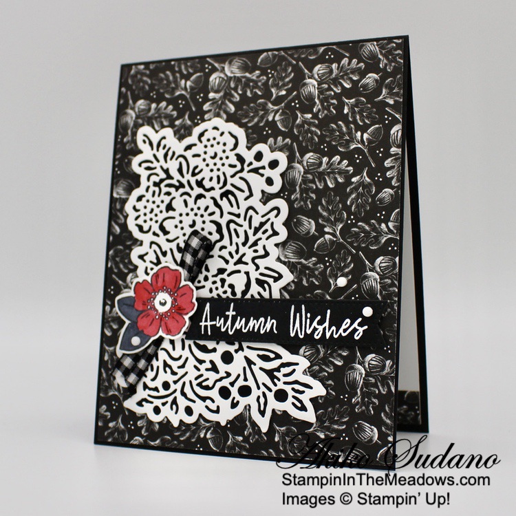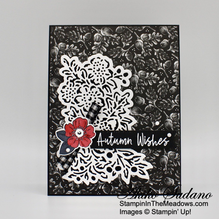 I adhered a panel of Rustic Harvest designer series paper to a Basic Black card base with liquid glue. I cut the large floral dies from the Stampin’ Up! Fond Of Autumn bundle from Basic White using both the detailed die and the outline die. I cut the outline die from a Basic Black panel and adhered them together with liquid glue. I adhered the die cut to the card front with liquid glue.