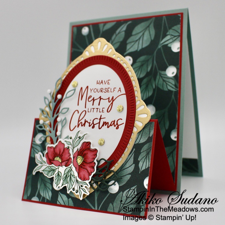 I adhered panels of the beautiful Christmas themed Fitting Florets DSP to the sections of the Real Red easel section before adhering the easel section to the front of a Soft Succulent card base with liquid glue. I cut the large oval frame from the Stampin’ Up! Framed Florets bundle and stamped the Framed and Festive sentiment in Real Red ink on the oval (save the frame for the next project). I cut another large oval frame from Brushed Gold foil and a small oval from Real Red card stock. I placed the stamped large oval inside the large frame and adhered the small frame on top with liquid glue. I cut anther small oval from Basic White and adhered the frame and oval to the back of the large frame with liquid glue. This gives a nice finished look to the back of the large oval frame.