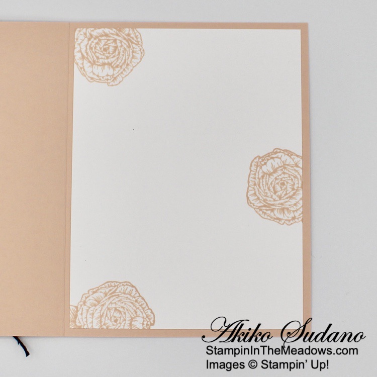 For the inside of the card, I stamped the small flower from the Stampin’ Up! Fragrant Flowers stamp set using Petal Pink ink on a Basic White panel and adhered the panel to the inside of the card with Stampin’ Seal.