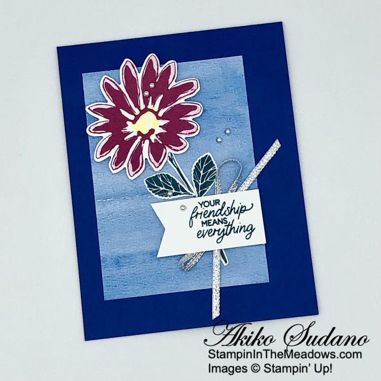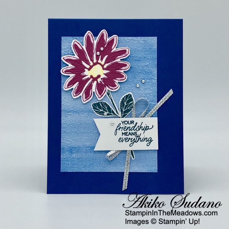 I stamped the sentiment from the Stampin’ Up! Cheerful Daisies stamp set in Pretty Peacock ink on Basic White and punched the end with the Banners Pick A Punch. I made a bow with silver metallic ribbon and adhered it to the back of the label before adhering the label to the card with dimensionals. I finished the card with silver metallic pearls.