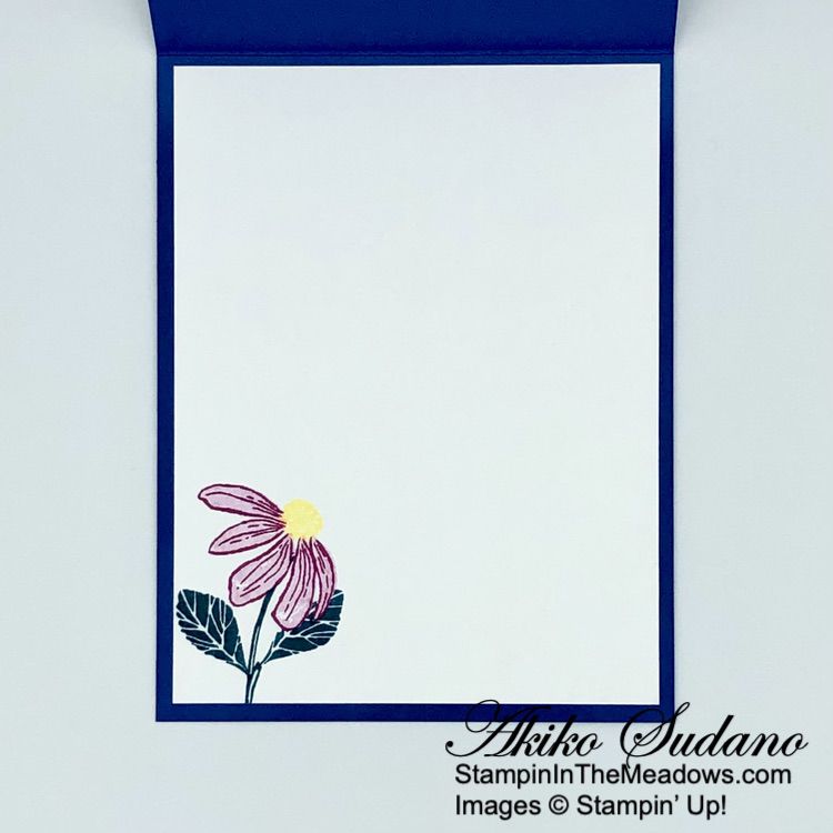 For the inside of the card, I stamped the detailed side view flower from the Stampin’ Up! Cheerful Daisies stamp set in Berry Burst ink and stamped the filler stamp in twice stamped off Berry Burst ink on the bottom of a Basic White panel. I stamped the small flower center in Lemon Lolly ink and covered the flower with a mask before stamping the leaves and stem in Pretty Peacock ink. I adhered the panel to the inside of the card with Stampin’ Seal.