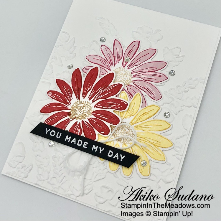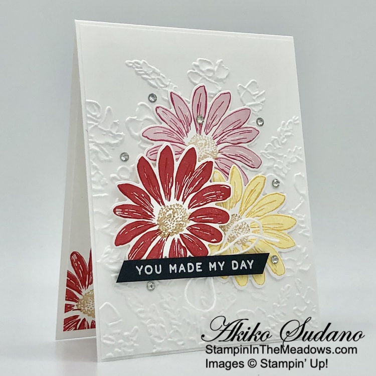 The Stampin’ Up! Cheerful Daisies stamp set makes beautiful flowers, even without the fancy die cuts. The two step stamping is pretty easy to do and it’s a lot of fun to play with different color combinations. I think this would have been pretty with all red daisies too – maybe next time.