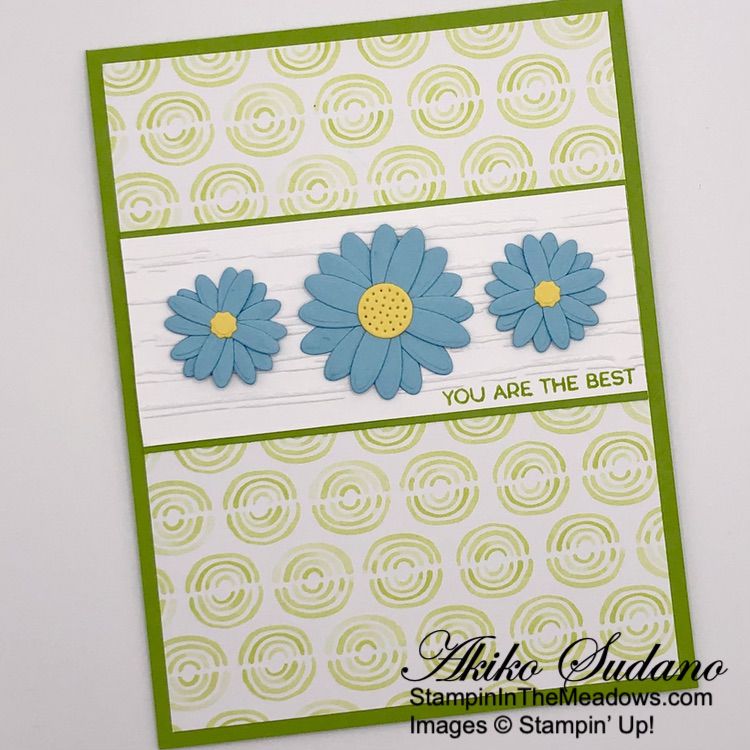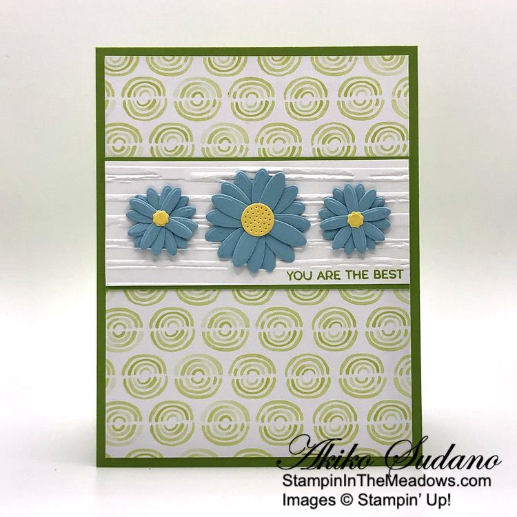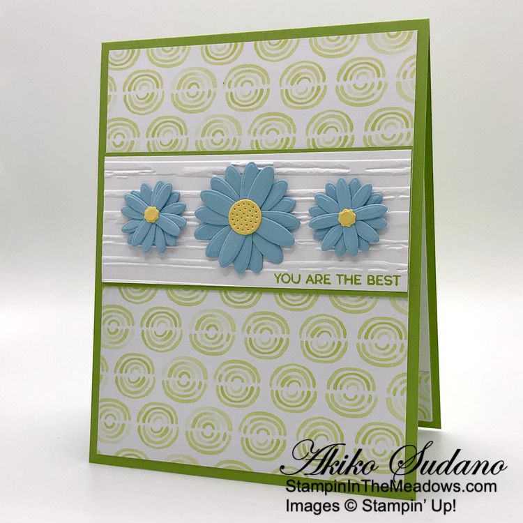 I stamped the sentiment from the Stampin’ Up! Timeless Arrangements stamp set in Granny Apple Green ink on a Basic White strip. I embossed the strip with the Stripes 3D embossing folder and adhered it to a Granny Apple Green mat. I adhered the layered panel to a panel of Bright and Beautiful 6″ x 6″ designer series paper with liquid glue and adhered it to the front of a Granny Apple Green card base.