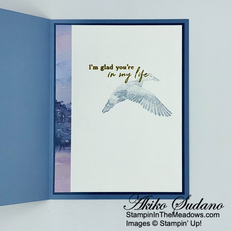 For the inside of the card, I stamped the sentiment from the Stampin’ Up! Feathered Flight stamp set in Wild Wheat ink on a Basic White panel. I used twice stamped off Misty Moonlight ink to stamp the large duck and trimmed the side with DSP. I adhered the panel to a Misty Moonlight mat and then to the inside of the card with Stampin’ Seal.