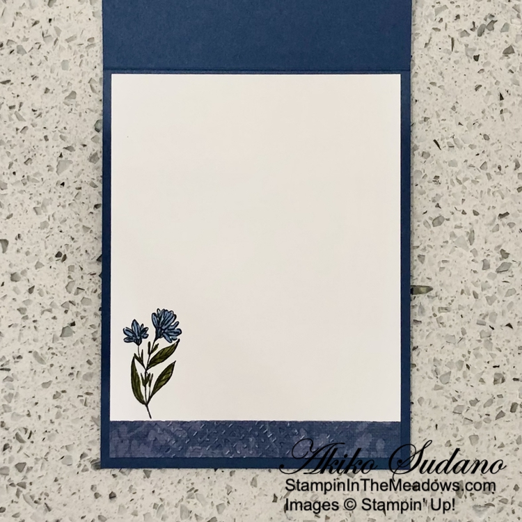 For the inside of the card I stamped another flower from the Stampin’ Up! Wildflower Designs stamp set in Memento Tuxedo Black ink on a Basic White panel. I colored it with light Boho Blue and dark Old Olive Stampin’ Blends. I embossed a strip of Wildly Flowering DSP and adhered it to the bottom of the panel and adhered the panel to the inside of the card with Stampin’ Seal.