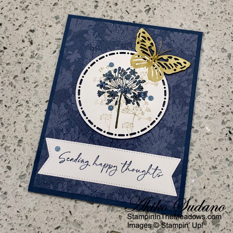 I colored one of the butterfly cutouts from the Paper Butterfly Accents with the light Wild Wheat Stampin’ Blend and adhered it to the corner of the die cut circle with glue dots. I adhered the circle and butterfly to the card with dimensionals.