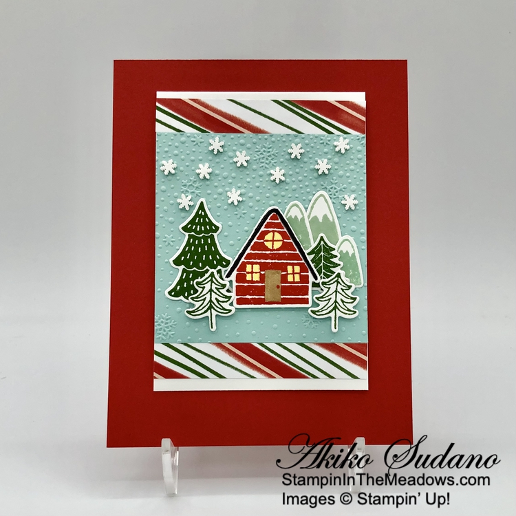 I built the scene on the embossed panel starting with the mountains and adhered them with glue dots. I adhered the Garden Green Trees with glue dots and adhered the house with dimensionals. Lastly, I used dimensionals to adhere the two small line trees. I adhered a bunch of White Loose Snowflakes to the sky using glue dots.