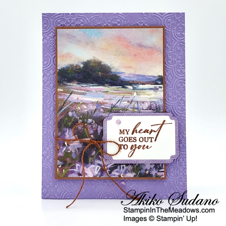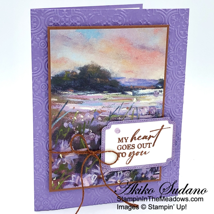 I stamped the sentiment from the Stampin’ Up! Unbounded Love stamp set in Copper Clay ink on Basic White and cut it out with the rectangle die. I cut a mat from a Highland Heather panel of Splendid Autumn DSP and adhered it to the back of the sentiment. I adhered the label to the card with dimensionals, doubling up on the overlap. I finished the card with Fresh Freesia tinsel gems.