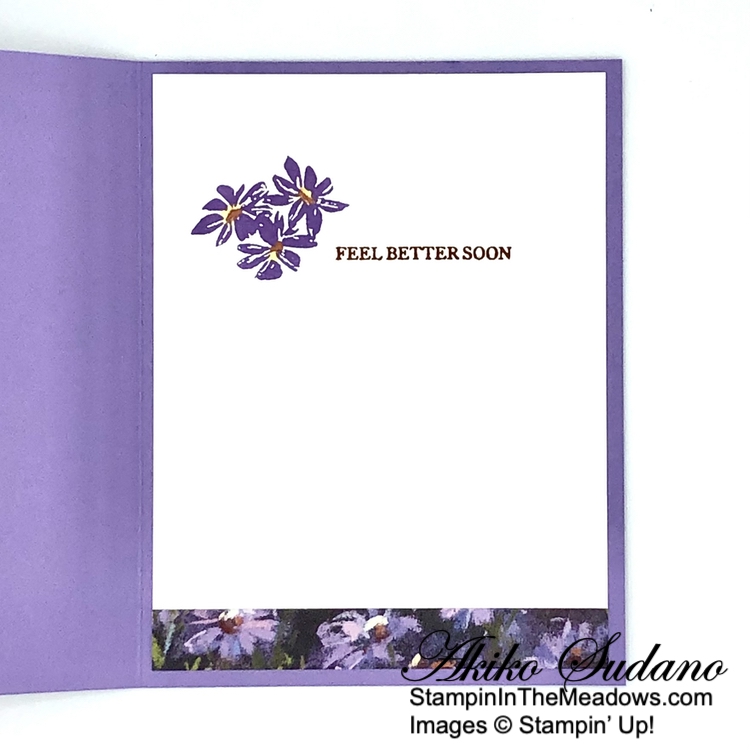 For the inside of the card, I stamped the triple flower from the Cheerful Daisies stamp set using Highland Heather ink and stamped the sentiment from the Stampin’ Up! Unbounded Love stamp set next to the flowers using Copper Clay ink. I used the light Copper Clay and light Lemon Lolly Stampin’ Blends to accent the flower centers. I trimmed the bottom with DSP and adhered the panel to the inside of the card with Stampin’ Seal.