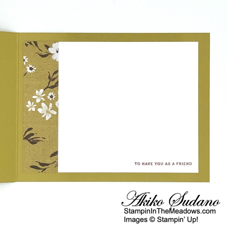 For the inside of the card, I stamped the sentiment from the Stampin’ Up! Autumn Leaves stamp set using Moody Mauve ink on Basic White. I trimmed the side with DSP and adhered the panel to the inside of the card with Stampin’ Seal.