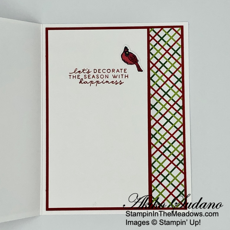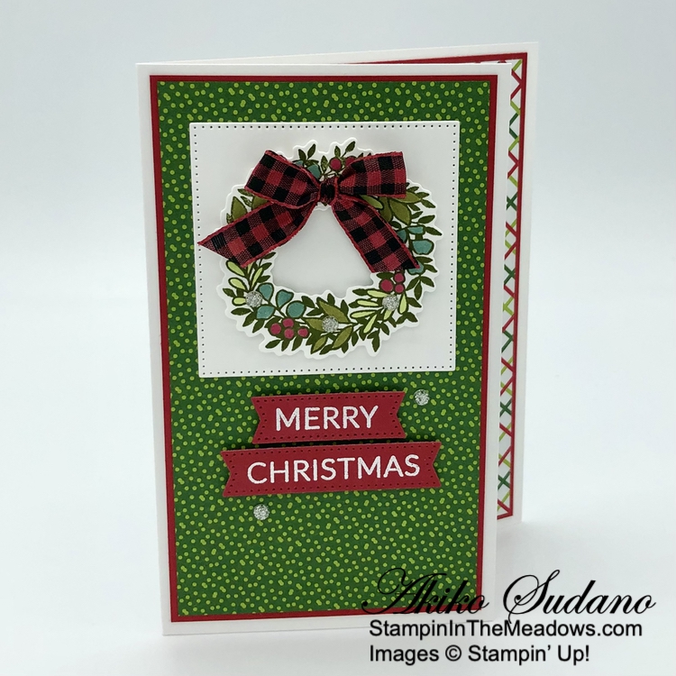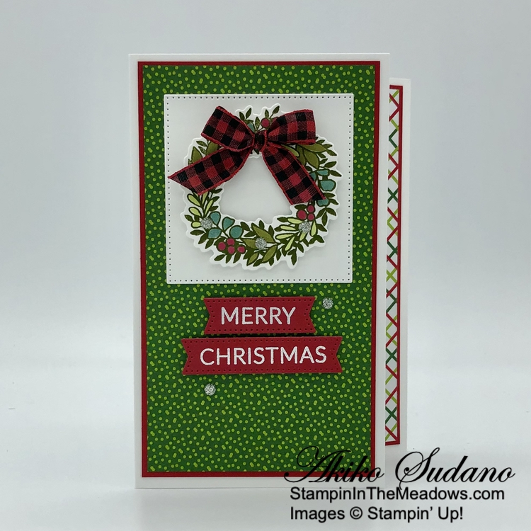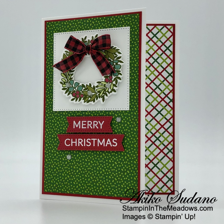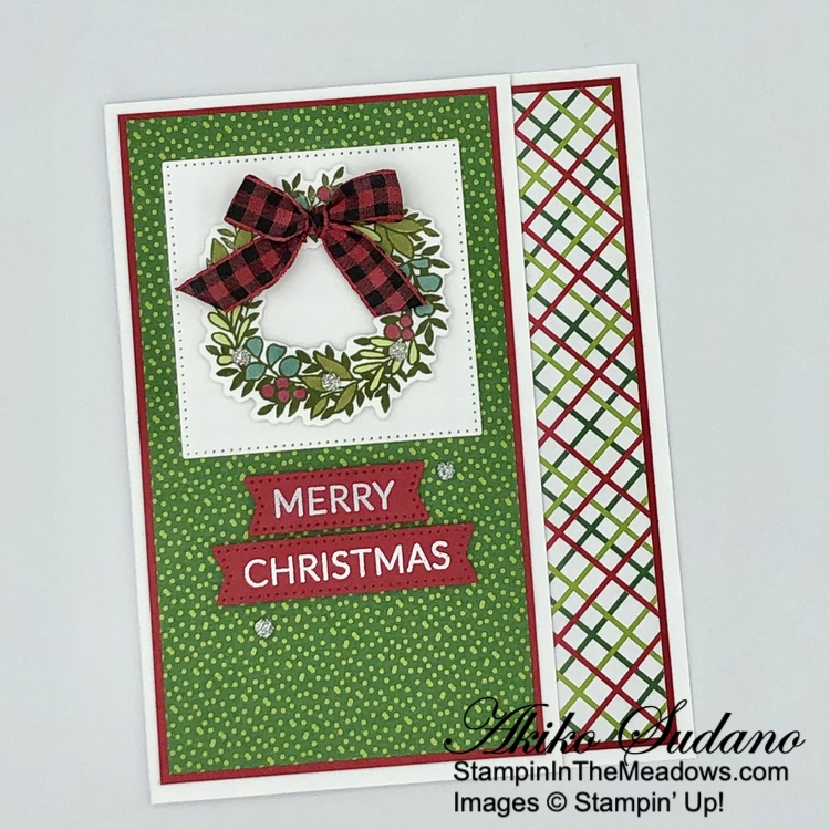 Such a pretty card Akiko! Love the little peek inside on the edge and that plaid bow is perfect with the wreath! 🙂
