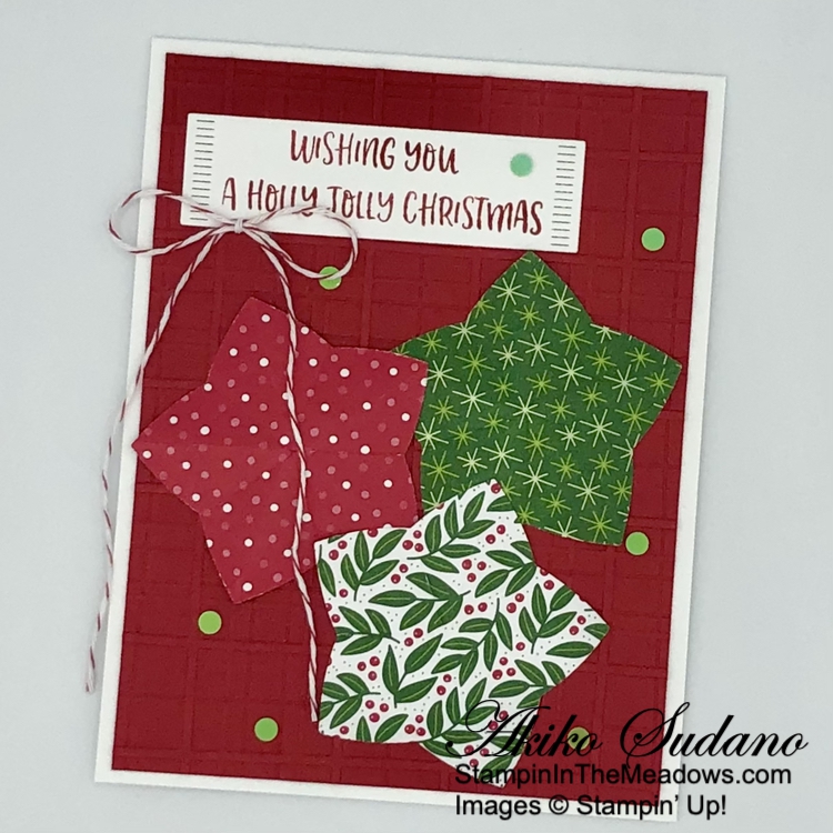 Happy Saturday! Here’s a simple Christmas card made with the fun Stampin’ Up! Sweetest Star bundle. I used the punch with the pretty Take A Bow 6″ x 6″ designer series paper to make dimensional stars for the card front. You can find the products I used at the bottom of my post along with the card stock sizes.
