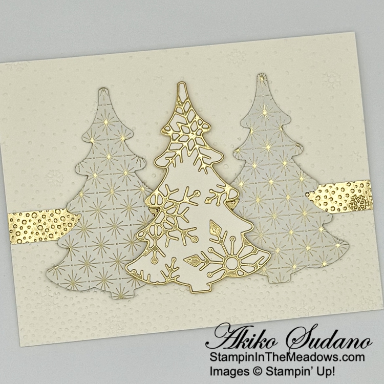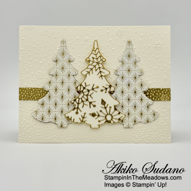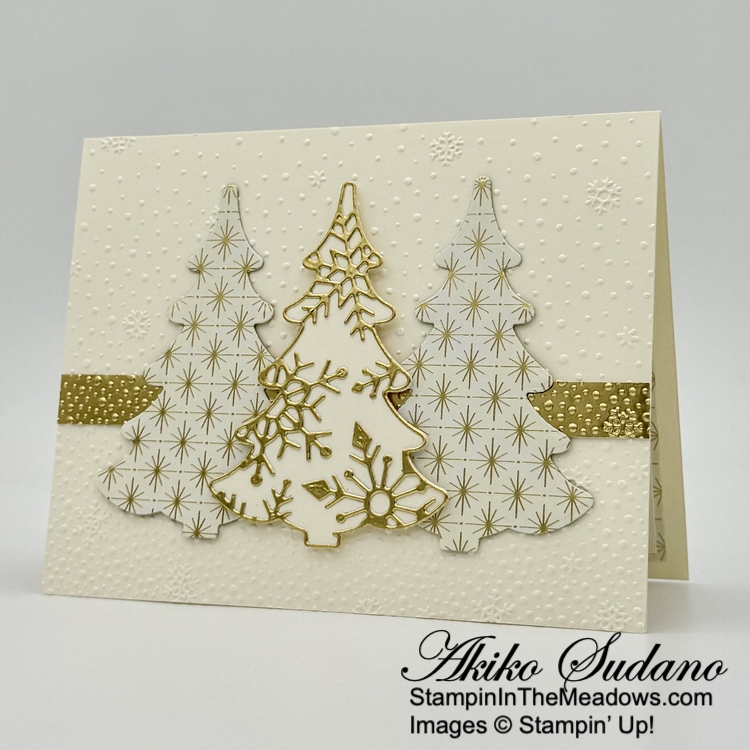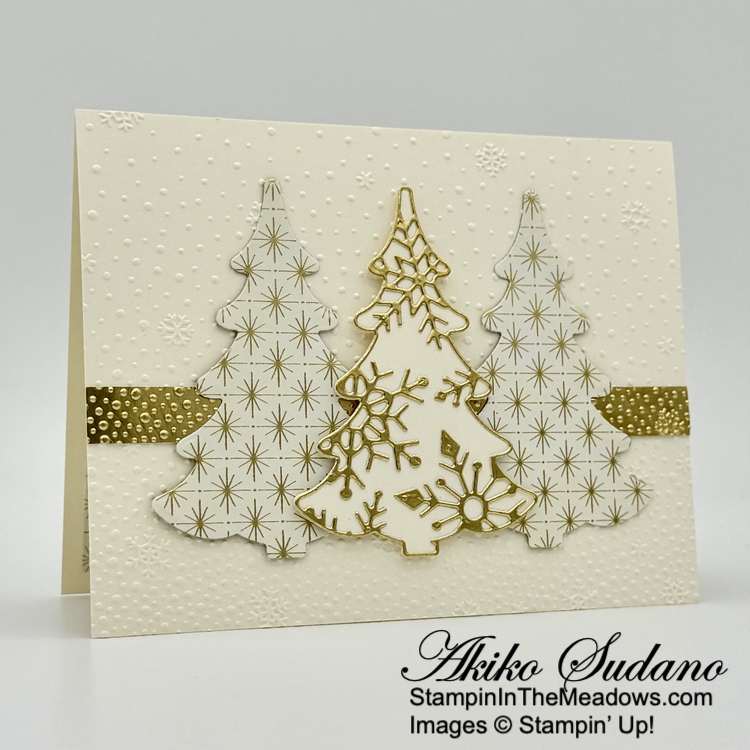 I I used the plain tree die from the Stampin’ Up! Decorative Trees dies to cut two panels from the Season of Green and Gold specialty designer series paper. I adhered the trees to the card with glue dots.