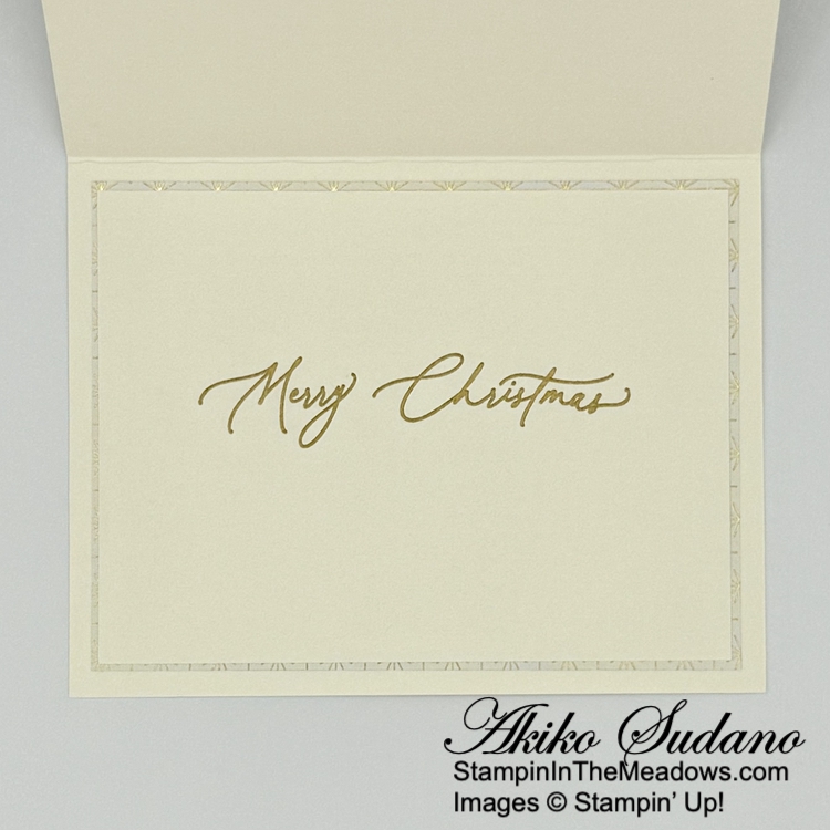 For the inside panel, I stamped sentiments from the Greetings of the Season stamp set using Versamark ink on a Very Vanilla panel. I sprinkled it with gold embossing powder and shook off the excess. I heated the powder with my heat tool until it was bright and shiny. I adhered the panel to a DSP mat and adhered the layered panel to the inside of the card with Stampin’ Seal.