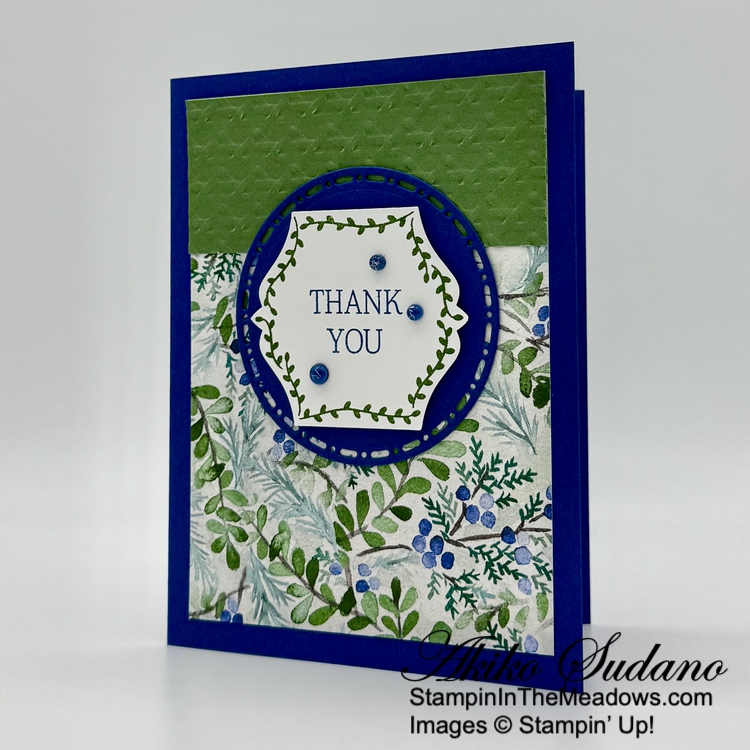 I stamped the leafy border stamp from the Stampin’ Up! Bright Borders stamp set using Garden Green ink and punched it out with the To The Point punch (both coming January 7, 2025). I stamped the sentiment from the Stampin’ Up! Bright Borders stamp set using Blueberry Bushel ink. I cut a Blueberry Bushel panel with a circle die from the Spotlight on Nature dies and adhered the punched label on top with dimensionals.