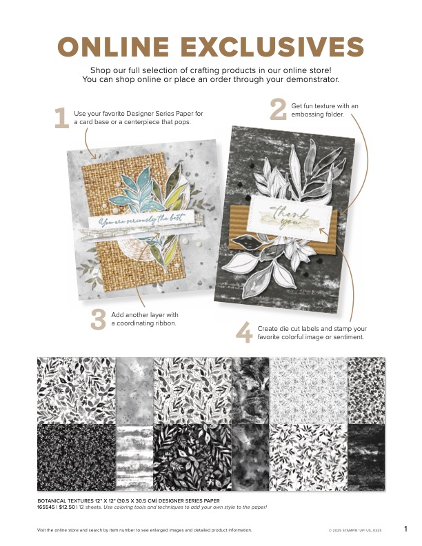 The pretty Stampin’ Up! Textured Notes bundle will be available on March 4 with the new release of Online Exclusives. Click on the picture below to download a flyer with details of this bundle and other items in the Botanical Textures Suite Collection.