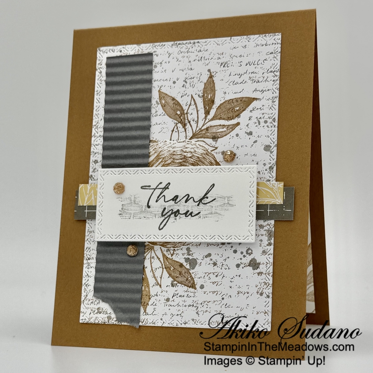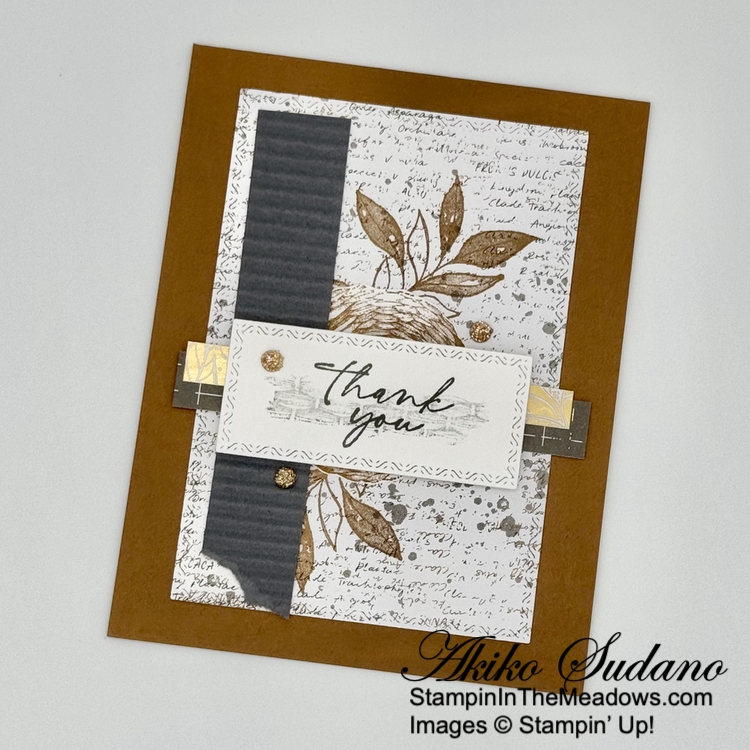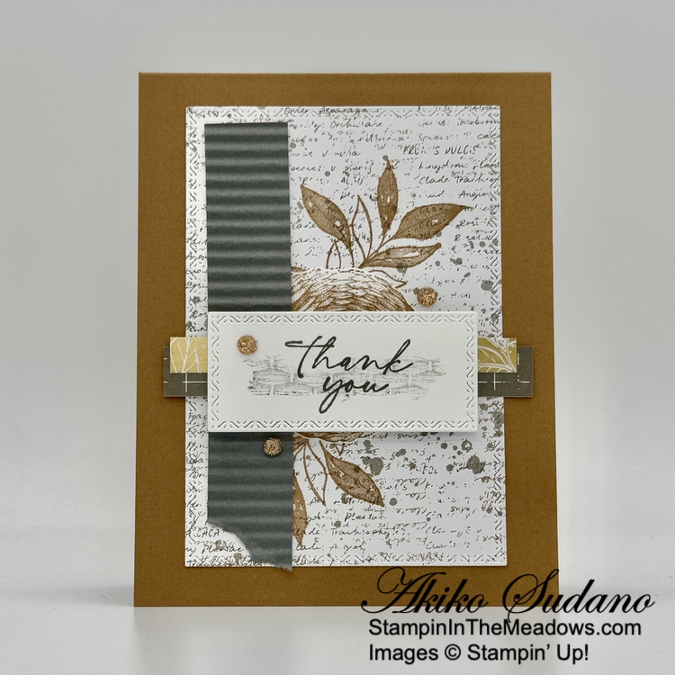 I stamped a panel of Nature’s Sweetness specialty designer series paper with the large leaf sprig from the pretty Stampin’ Up! Textured Notes stamp set using Pecan Pie ink. I stamped the image twice so that the image flowed on a diagonal across the panel. I cut it out with one of the awesome rectangle dies and adhered it to the front of a Pecan Pie card base.