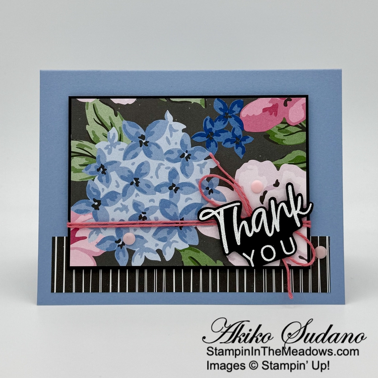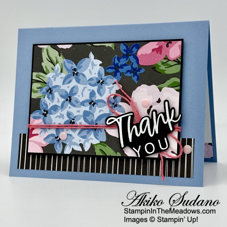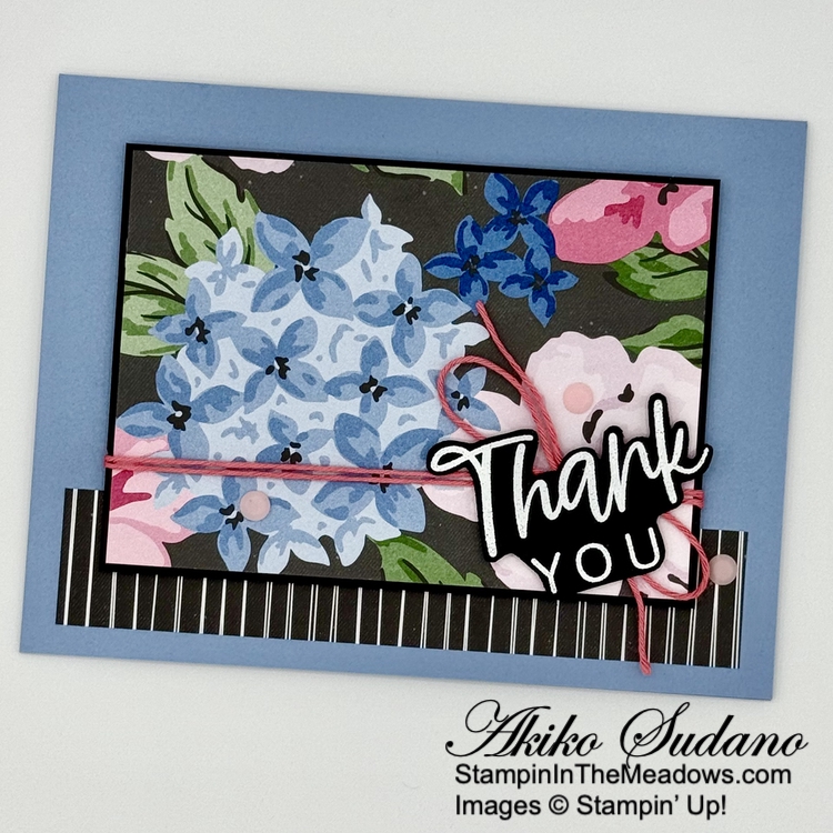Good Morning! Here’s a simple thank you card made with the pretty Stampin’ Up! With You In Mind stamp set and the beautiful Lovely Garden designer series paper. The big, bold sentiments in the stamp set go well with thebold and beautiful flowers in the DSP. You can find the products I used at the bottom of my post along with the card stock sizes.