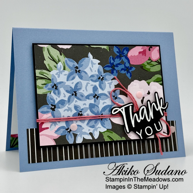 Adhere another floral pattern of the Lovely Garden DSP to a Basic Black mat and wrap it with Strawberry Slush baker’s twine and make a bow on the right side. Adhere the layered panel to the card with dimensionals.