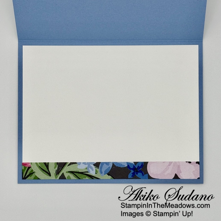For the inside of the card, adhere a strip of DSP to the bottom of a Basic White panel and adhere the panel to the inside of the card with Stampin’ Seal.