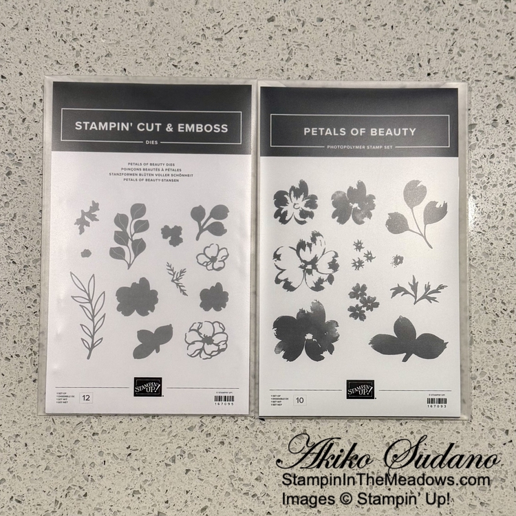 The Stampin’ Up! Petals of Beauty bundle is a pretty floral set with two step stamping and dies to cut the stamped images and cardstock. Here is the stamp set and dies that are in the bundle. Note that these come in the new larger Stampin’ Up! packaging. Also, these new plastic packages will be available in packs of 10 for $16 on Nov 4!