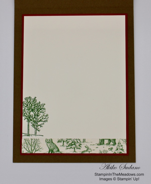 I decorated the inside of the card by stamping the trees from the Stampin’ Up! Nature’s Beauty stamp set in Garden Green on a panel of Very Vanilla. I adhered a strip of the Toile Tidings DSP to the bottom of the panel. I adhered it to a Cajun Craze mat and then to the inside of the card.